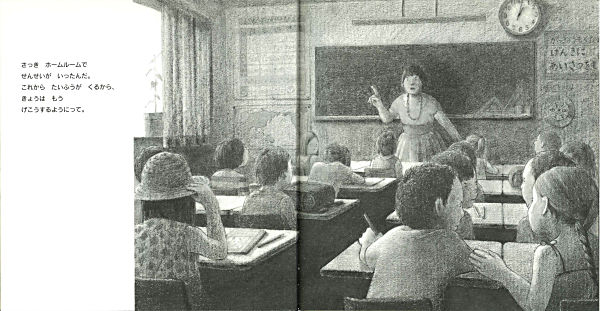 金曜日、ぼくは悲しい。明日は家族そろって海へ行くのに、台風が近づいているから。空はどんどん暗くなり、雨も強くなってきて、少年の不安を表すようなモノクロの絵の中で、ただ1色使われた青色が印象的な絵本。第25回ニッサン童話と絵本のグランプリ絵本大賞受賞作。