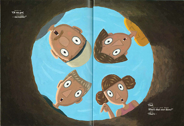 旅行にいくことにした、つよしとけんた。地面に穴をほって、地球の裏側にいってみよう。めざすはアメリカ!ほって、ほって、着いたところは・・・。地面をほって地球の裏側へ行きたい!という子どもたちの夢を絵本で実現。各ページの絵と文に角度がついていて、少しずつ回転させながら読んでいく構成です。日本を出発したときには縦書きだった文章も、アメリカに着くころには横書きに。地面の中に描かれた化石や地底人も楽しい。川端誠のウルトラ・ナンセンス・アドベンチャー絵本です。