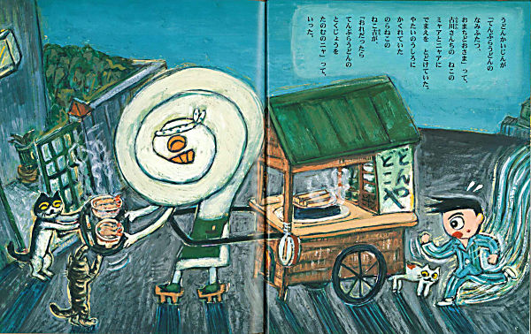 夜中に現れた怪しい「うどんかいじん」。おいかけていくと、うどんかいじんは変な客に次々とうどんを出前していく。とうとうぼくは野良猫のねこ吉といっしょに、200杯の月見うどん作りを手伝うことに・・・。読んだ後に、美味しいうどんが食べたくなる奇天烈うどん絵本。