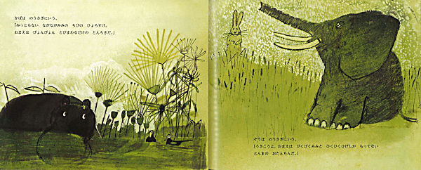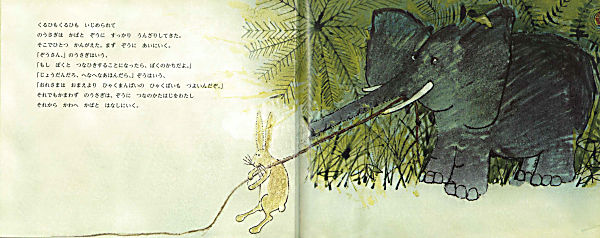 いつも、かばとぞうにいじめられて、うんざりしていたのうさぎ。そこである日、考えたのうさぎは、かばとぞうにつなひき勝負をもちかけます。アフリカ民話をもとにした作品。バーニンガム氏初期の同名の作品(レタ・シャッツ・文 1968年出版 未邦訳)を編集しなおし、文も自身で書き直して新たに出版しました。力強いタッチの絵に谷川俊太郎の軽妙な訳が光ります。小学校低学年から