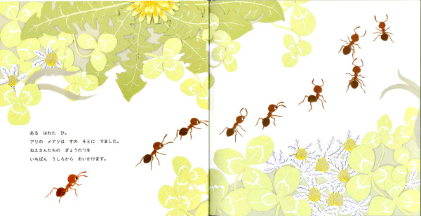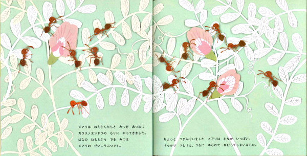 はじめ、クモが気になってましたが、アリさんの大きな冒険、楽しく見させてもらいました。3年前にこの本と出合えていたら、ちょうど野外活動のテーマと合っていたのにと惜しく読みました。繊細な切り絵もステキです。