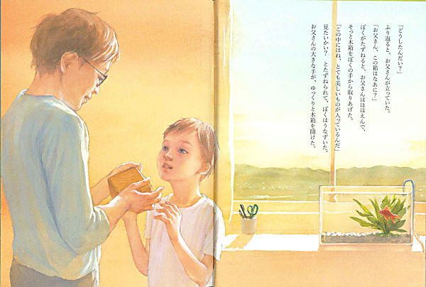 お父さんの部屋から、ハタリと音がした──。「ぼく」は、夕日に染まるお父さんの部屋で、小さな木箱をみつけます。中に入っていたのは、1枚だけの蝶の羽。やってきたお父さんは、大好きだった蝶の羽を大切にしまっているんだと教えてくれました。その夜、さびしそうに故郷の山をみつめる蝶の夢をみた「ぼく」は、翌朝、画用紙と絵の具を用意して、蝶の仲間を作りはじめます。「ひとりきりでさびしいと思うんだ。だからぼくが仲間を作るんだよ」。「ぼく」の優しさやお父さんの思いが、切なく温かく胸に迫ります。