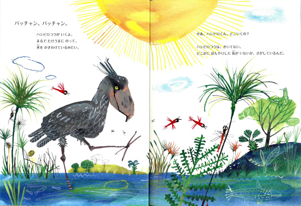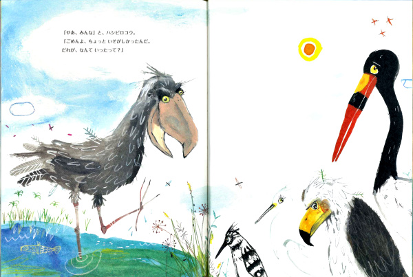 アフリカには、いろんな鳥が住んでいます。なかでも変わっているのは、ハシビロコウ。大きなおなかに靴のようなくちばし、クジラみたいな頭に恐竜のような翼・・・。おかげでほかの鳥たちは、かげぐちを言いたい放題。でも、実はハシビロコウは、だれよりもすごい鳥だったのです!