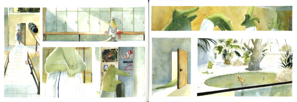目覚ましが鳴りひびく。朝のしたくをして、行きかうひとでにぎわいだした街のなかへ歩きだす。いつものひと、いつもの道、いつもの雑踏をぬけて、ワニがしごとにでかけます。すみずみまで描き込まれた絵が、文字なしで語られるストーリーを際立たせます。子どもはもちろん、大人も楽しい、イタリアの文字なし絵本。