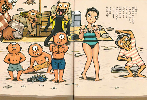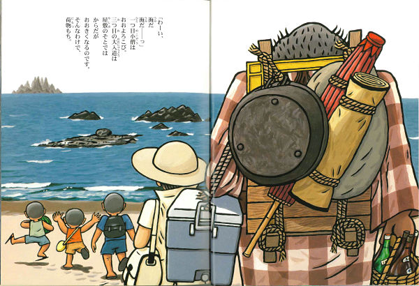 今年もお化け屋敷の連中が、海水浴にやってきました。一つ目小僧とろくろっ首は大喜びで海へ入っていきます。三つ目の大入道と一つ目の青坊主はからかさのしたで、のんびり昼寝・・・。楽しい夏の一日です。