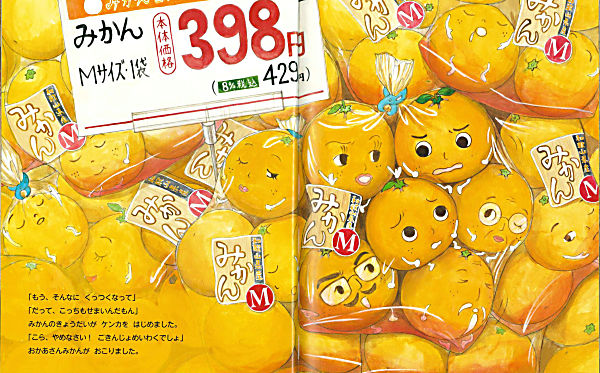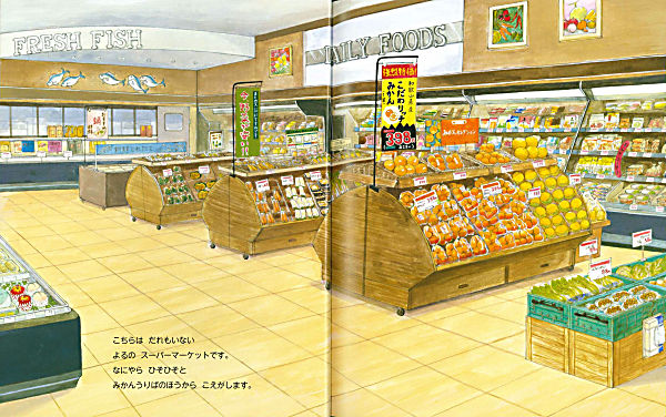 「もう、こんなぎゅうぎゅうはいやだー!」と、ふくろからとびだしたみかんのきょうだい。誰もいないお店の中を、たんけんに出かけす。見よう見まねでお金を払い、念願のチョコも口にしますが・・・。かわいいみかんたちがスーパーのあちこちを動き回ります。実際にスーパーを取材して描いた、リアルな店内の描写も見事な、楽しいお話です。第38回日産童話と絵本のグランプリ絵本大賞受賞作品。