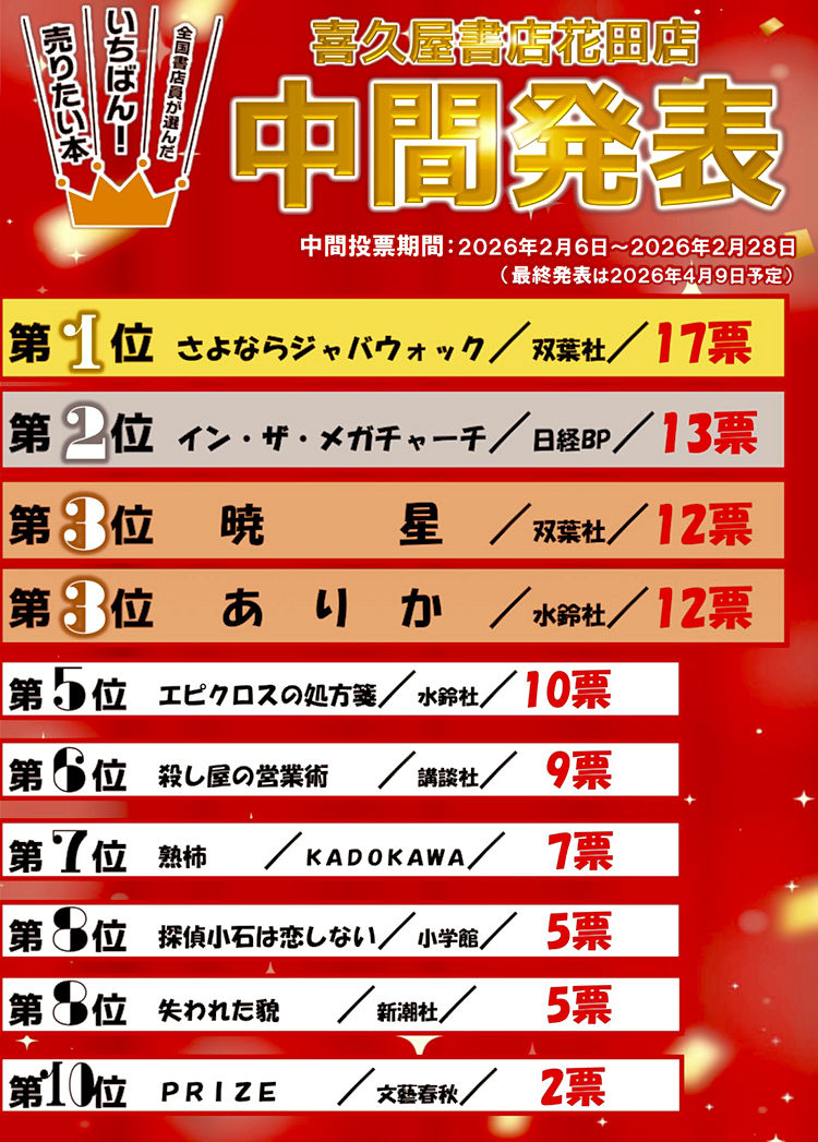 【花田店 本屋大賞予想投票中間発表】