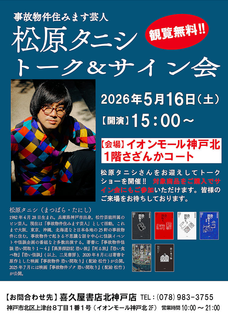神戸がご出身の、事故物件住みます芸人「松原タニシ」さんをお迎えしてトークショー&サイン会を行います!
