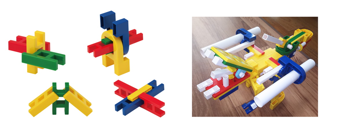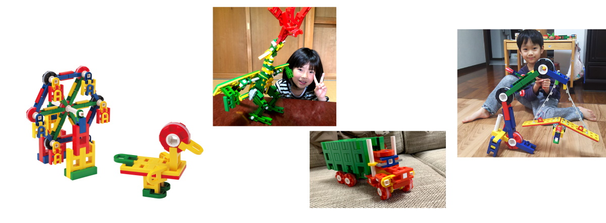 他のブロックと違い上に積み上げるだけではなく、縦横斜めと様々な方角から組むことができ、さらに動かすことができるブロックです。作るだけでは終わらない。それがリブロックです。